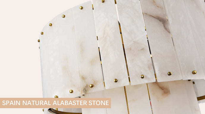 This image highlights the refined beauty of Spain-sourced natural alabaster, renowned for its soft translucence and cloud-like veining. Each stone panel displays unique patterns formed over thousands of years, allowing light to pass through with a warm, diffused glow. The material’s natural variations make every fixture one-of-a-kind, adding depth, elegance, and artisanal character to the design.