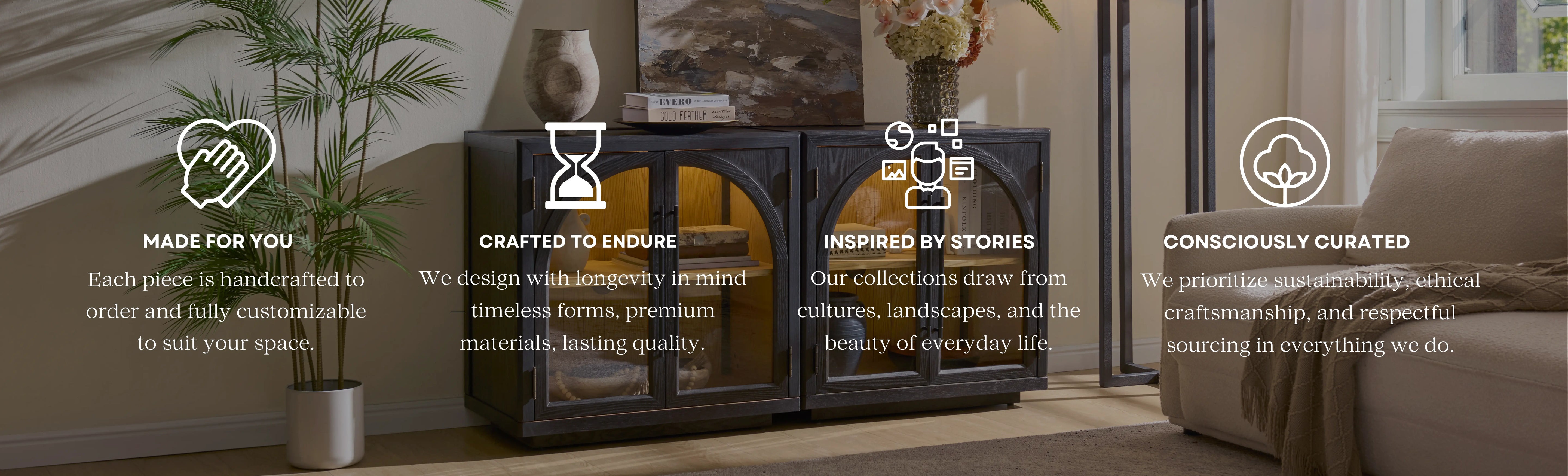 We believe no machine can match the artistry of the human hand or the discerning eye of a designer. Many of our pieces are handcrafted and one-of-a-kind, created in collaboration with skilled artisans. We proudly support community-driven craftsmanship with a focus on quality, sustainability, and ethical practices.
