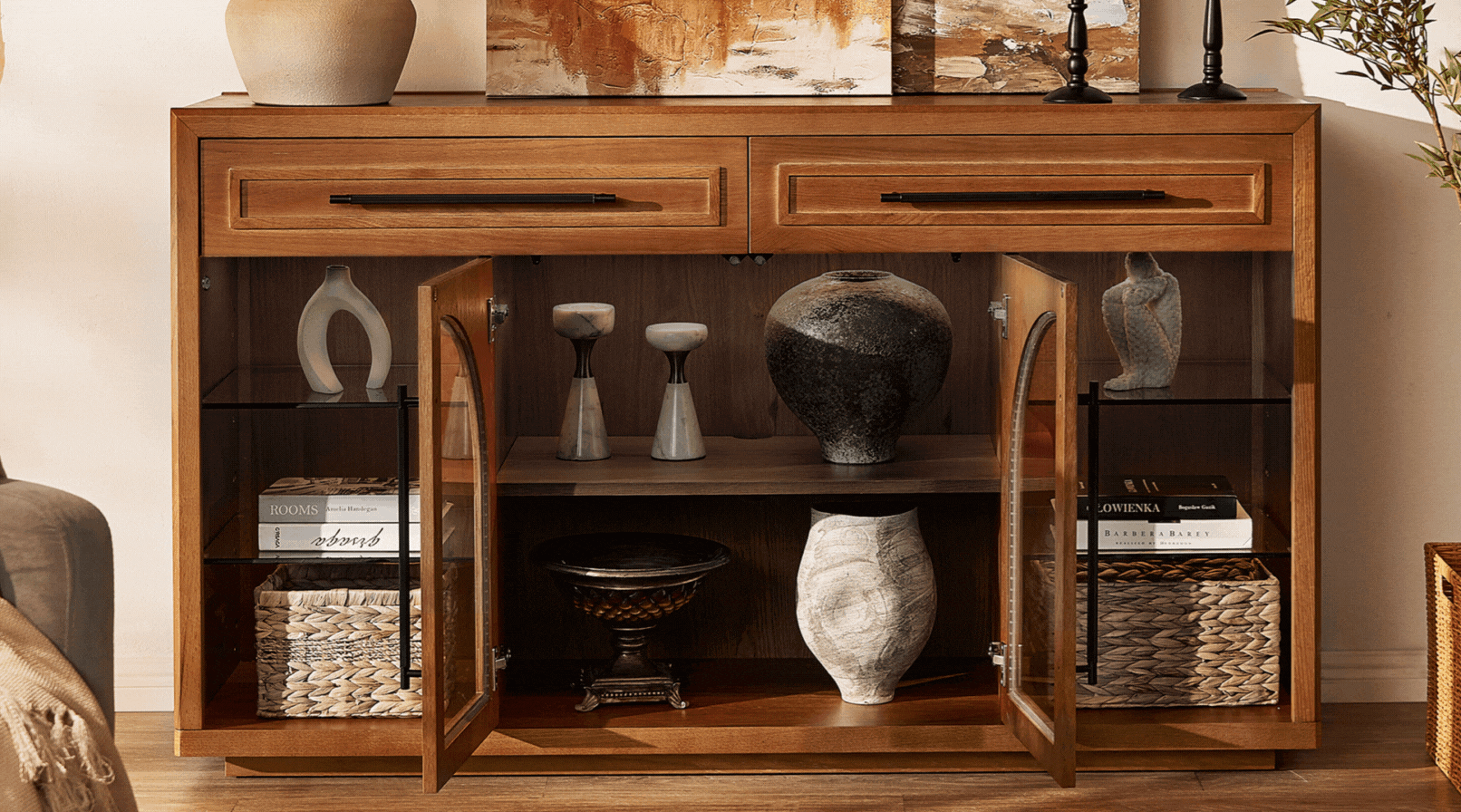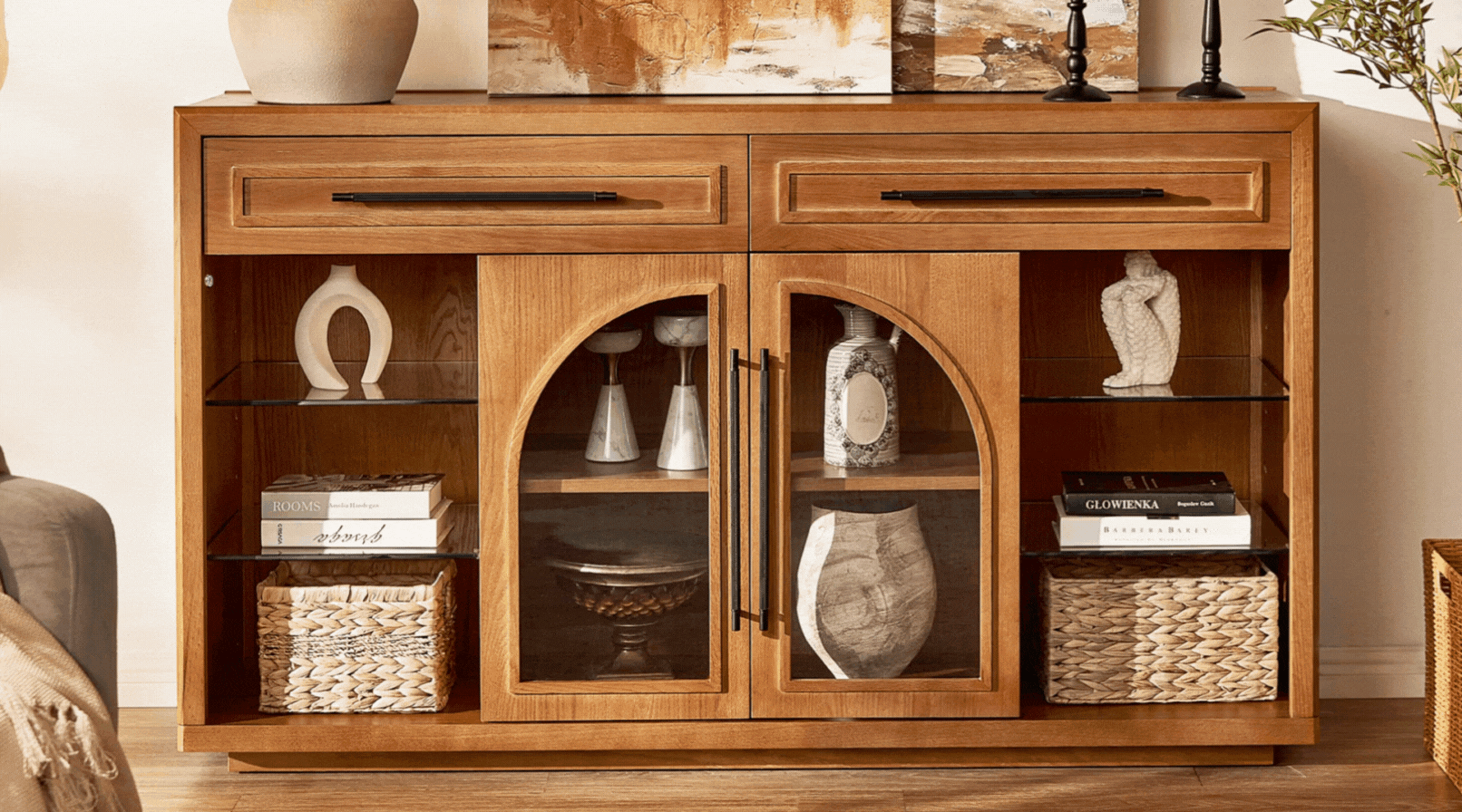 The Alvar collection blends functional versatility with architectural grace. Defined by its signature arched glass doors and warm oak finish, the design evokes a nostalgic mid-century charm while maintaining modern minimalism. This sideboard serves as a sophisticated focal point, offering a harmonious mix of open display and concealed storage to elevate any contemporary living space.