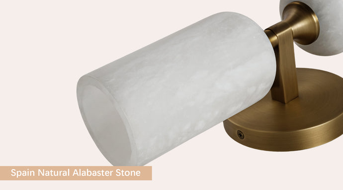 This image highlights the refined beauty of Spain-sourced natural alabaster, renowned for its soft translucence and cloud-like veining. Each stone panel displays unique patterns formed over thousands of years, allowing light to pass through with a warm, diffused glow. The material’s natural variations make every fixture one-of-a-kind, adding depth, elegance, and artisanal character to the design.