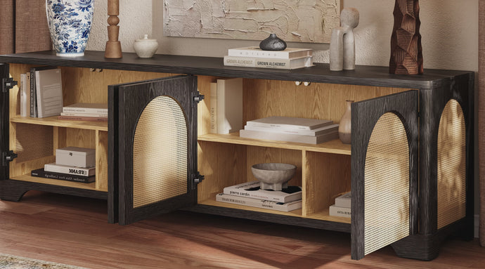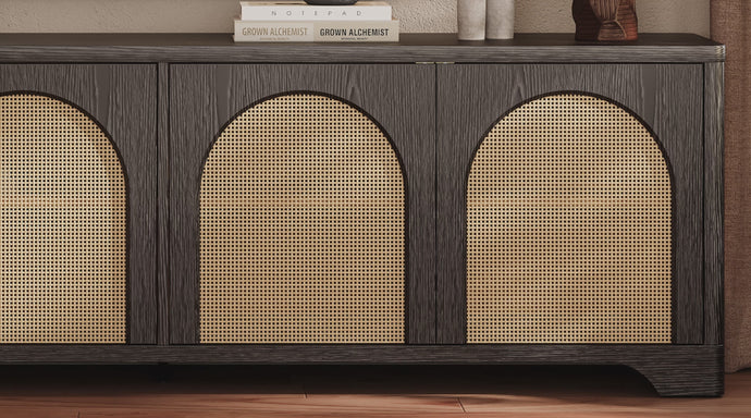 Bring soft architecture to your living space with the Cory TV Stand—a refined mix of deep-toned wood and breathable woven cane. The repeated arch fronts add an elegant rhythm, while the airy rattan texture keeps the silhouette light and inviting. Designed to anchor your media setup without feeling bulky, it offers clean-lined storage that keeps consoles, remotes, and everyday clutter neatly out of sight—so the room stays calm, warm, and considered.