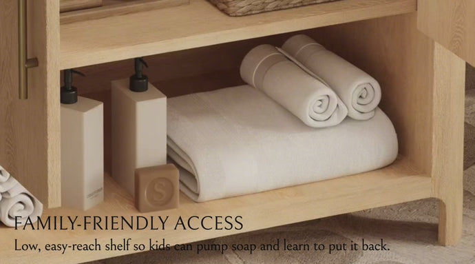 The Jude Bathroom Vanity masterfully blends natural warmth with modern minimalism for the bathroom space. The upper double cabinet doors offer ample, concealed storage, while the lower open shelf provides convenient access to everyday essentials, perfectly balancing practicality and visual appeal. Ideal for modern bathrooms, this vanity serves as a stylish and functional centerpiece, adding a touch of understated elegance to your space.