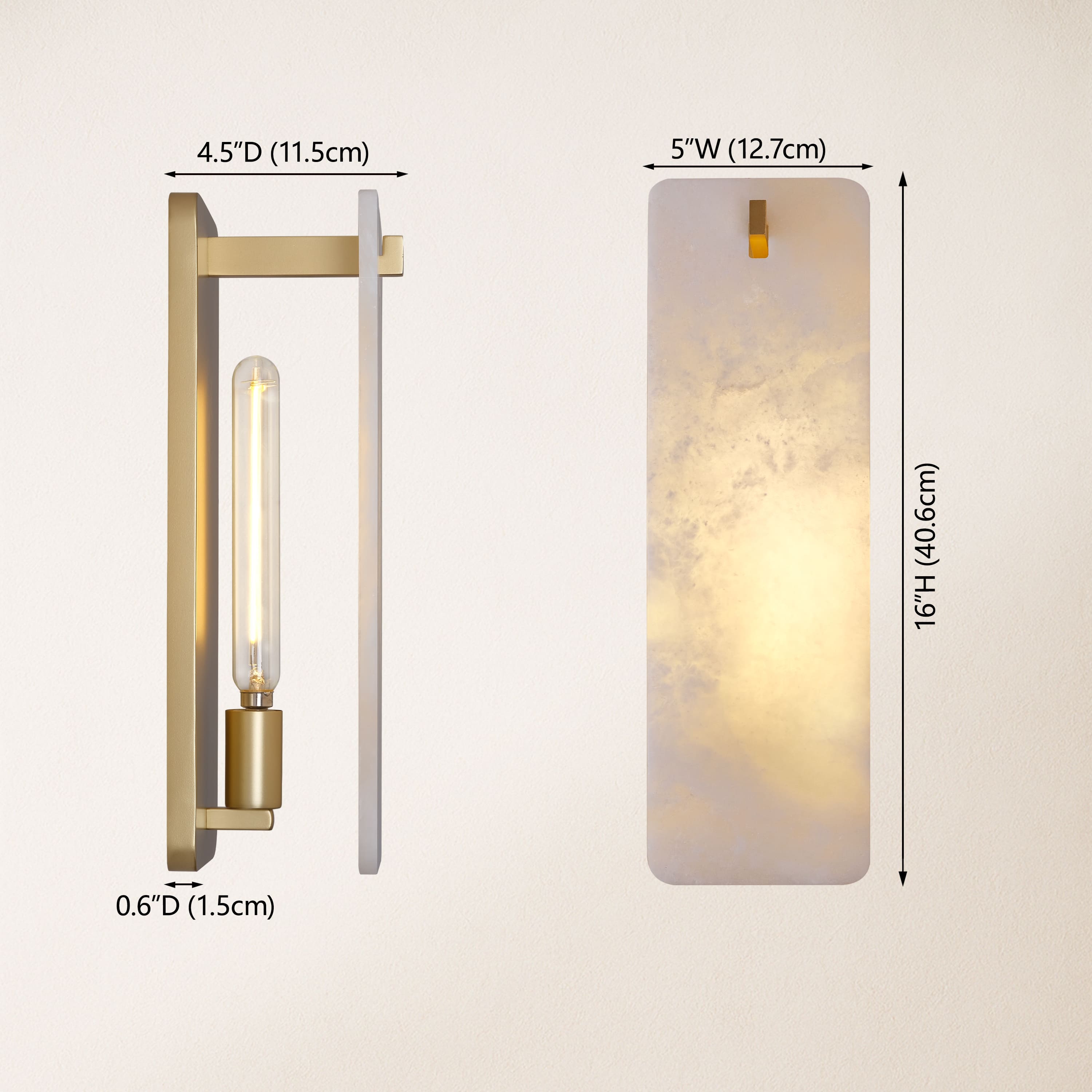 Lunara Alabaster Wall Sconce pairs a slender brass frame with a softly glowing natural alabaster panel, creating a balanced composition of light and material. When illuminated, the stone gently diffuses the light source behind it, revealing delicate natural veining and a warm, atmospheric glow. The minimalist vertical silhouette adds quiet sophistication without overwhelming the space, making it an ideal accent for hallways, bedrooms, bathrooms, or bedside settings. Both decorative and functional, this sconce brings a refined architectural touch while celebrating the organic beauty of real alabaster.