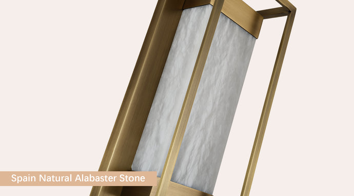 This image highlights the refined beauty of Spain-sourced natural alabaster, renowned for its soft translucence and cloud-like veining. Each stone panel displays unique patterns formed over thousands of years, allowing light to pass through with a warm, diffused glow. The material’s natural variations make every fixture one-of-a-kind, adding depth, elegance, and artisanal character to the design.