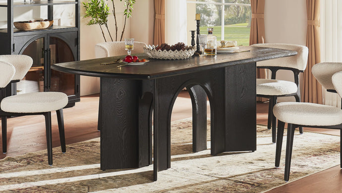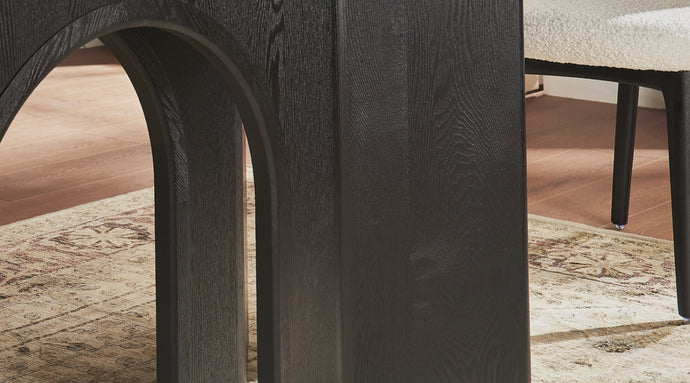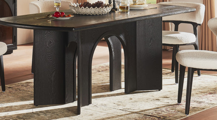 The Oren Dining Table masterfully blends organic texture with contemporary sophistication, creating a striking centerpiece for modern dining spaces. The precisely chamfered edges are elegantly finished with matching oak veneer edging, while the underside reinforcement is expertly constructed with solid oak. Seamlessly integrating natural wood grains with modern monochromatic elegance, the Dining Table makes a powerful design statement while offering robust functionality for both daily use and special gatherings.
