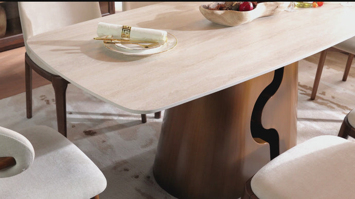 The Synergy Sintered Stone Dining Table masterfully combines sculptural artistry with exceptional durability, designed to anchor your dining space with a captivating, modern presence. The silhouette is defined by an innovative interlocking pedestal base that fits together like a puzzle, creating a dynamic, architectural focal point from every angle. Blending bold geometric forms with elegant textures, the Synergy Dining Table becomes a breathtaking centerpiece that elevates any gathering.
